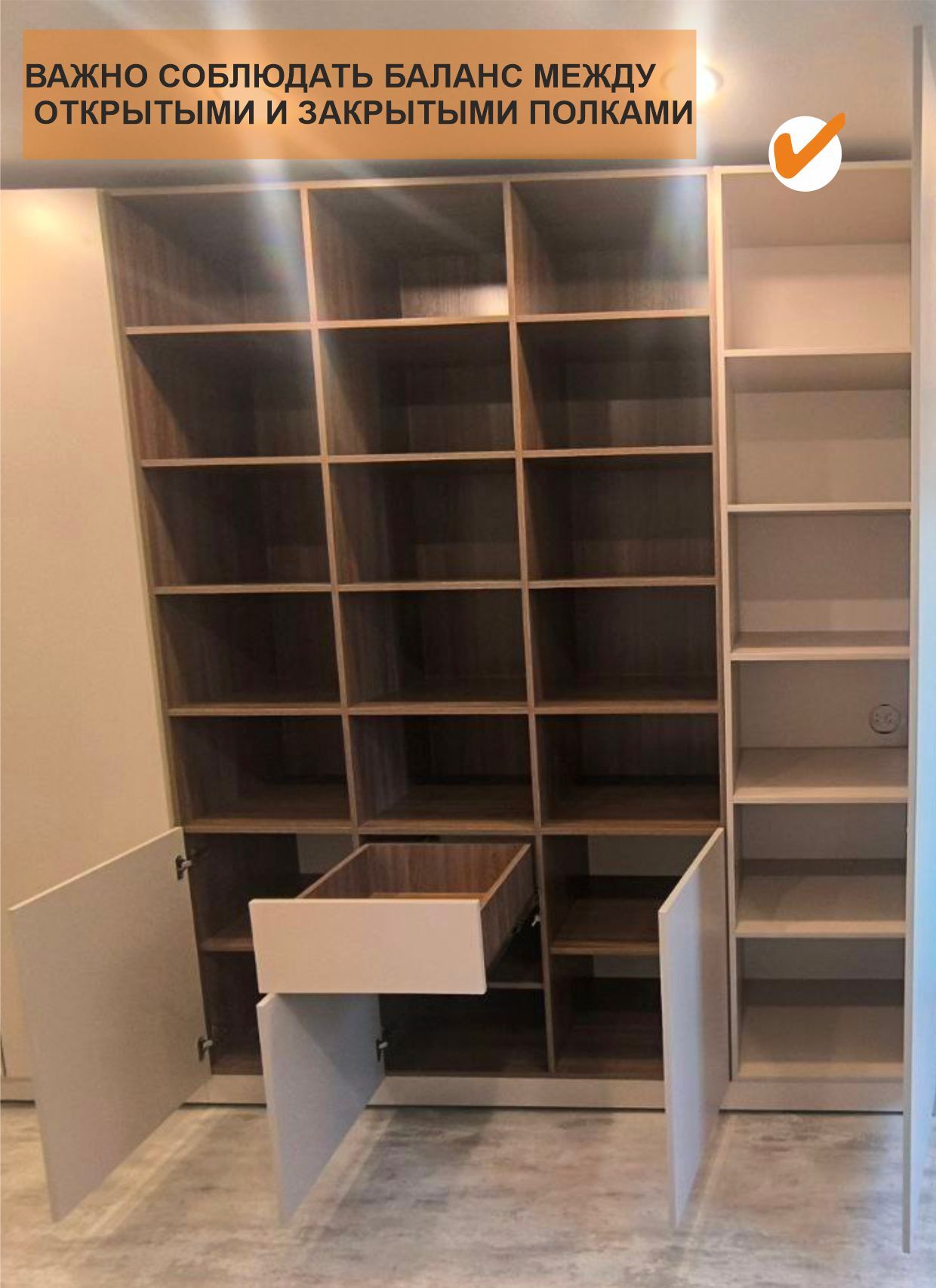 Шкаф для гостиной — стильное и функциональное решение для хранения одежды и аксессуаров. Внутри предусмотрены удобные вешала для одежды, а также закрытые полки с фасадами, которые помогут сохранить порядок и скрыть вещи от посторонних глаз. Открытые полки идеально подойдут для декоративных элементов или книг, создавая легкость и визуальный интерес в интерьере. Шкаф выполнен в элегантной комбинации двух цветов, что добавляет современный и гармоничный акцент в комнату. Дополнительным удобством служит зеркало, встроенное в дверцу, которое не только расширяет пространство визуально, но и практично для повседневного использования. Такой шкаф станет прекрасным дополнением вашей гостиной, объединяя стиль и комфорт.